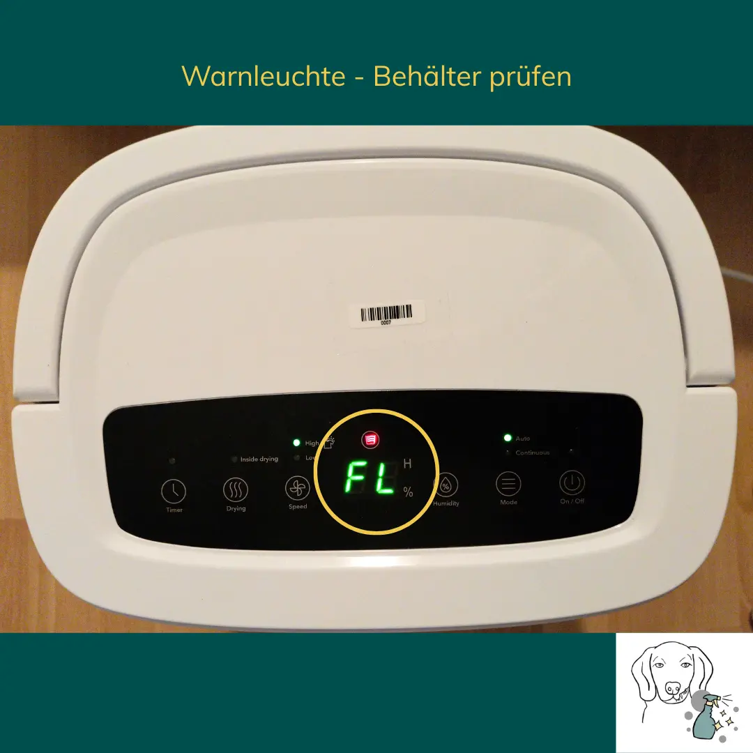 Keine Panik: Der Entfeuchter hat einen Automatik-Stopp. Er hört auf zu arbeiten, sobald der Tank voll ist, und zeigt dir das mit einer roten Lampe an. Erst wenn du den Tank geleert und wieder korrekt eingesetzt hast, läuft er wieder weiter.