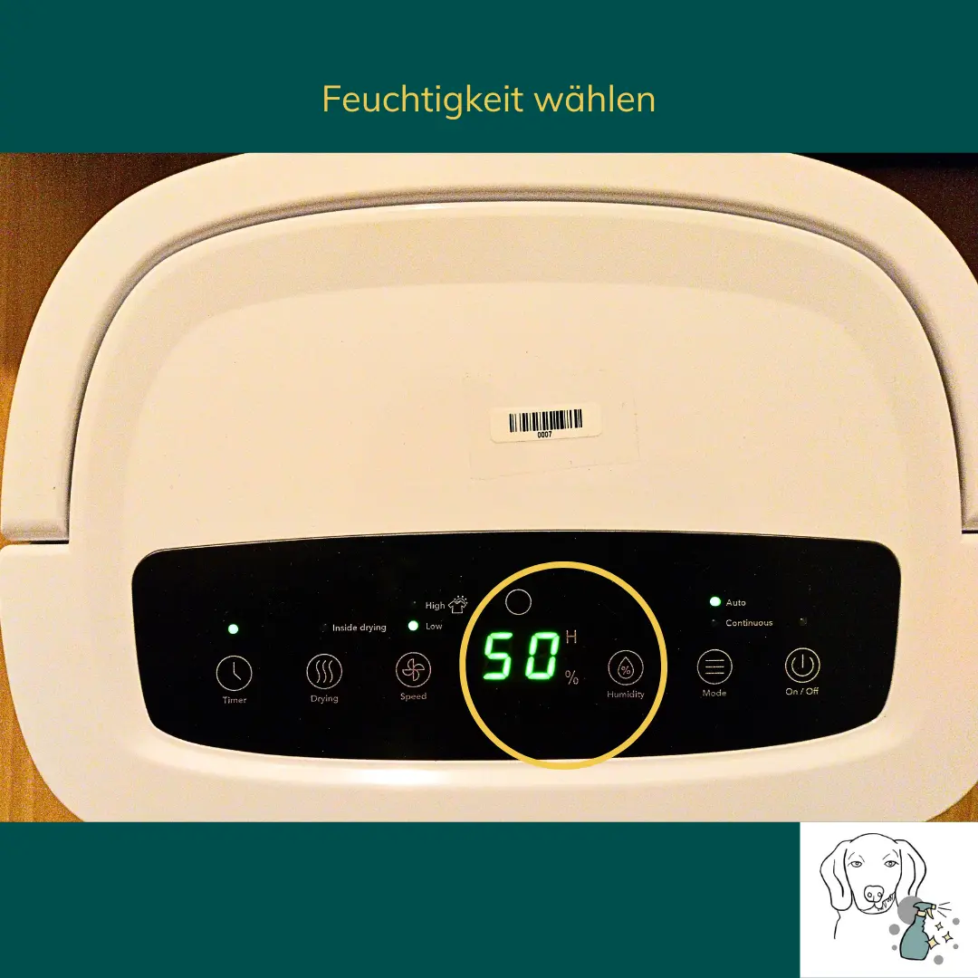 Drücke die Taste Humidity und wähle nun die gewünschte relative Luftfeuchtigkeit aus. Die Feuchtigkeit wird in % in der Segmentanzeige sichtbar.