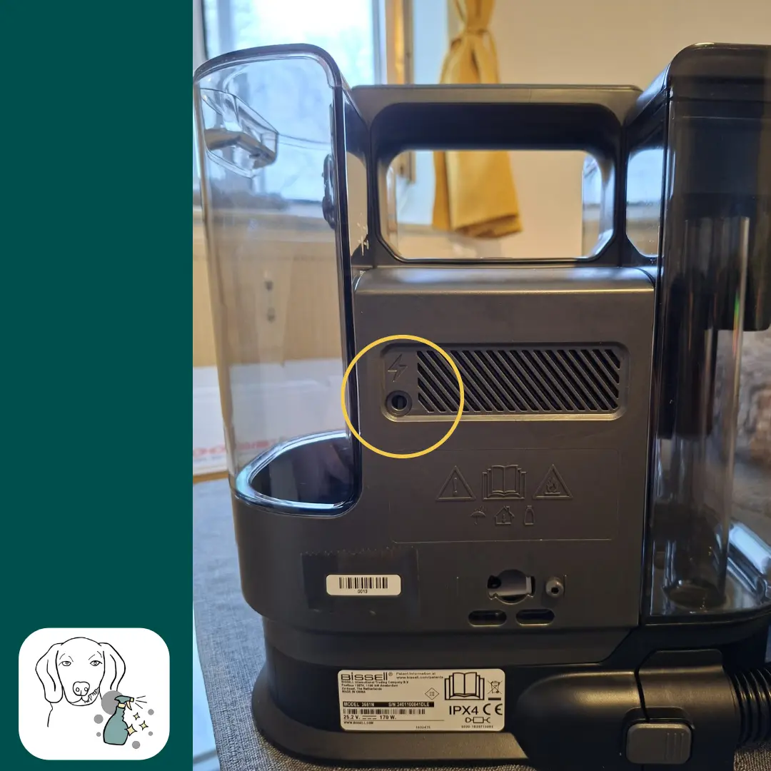 Auf der Rückseite des Saugers befindet sich der Ladeanschluss. Der Akku wird mit dem mitgeliefertem Ladegerät an einer haushaltsüblichen Steckdose aufgeladen.