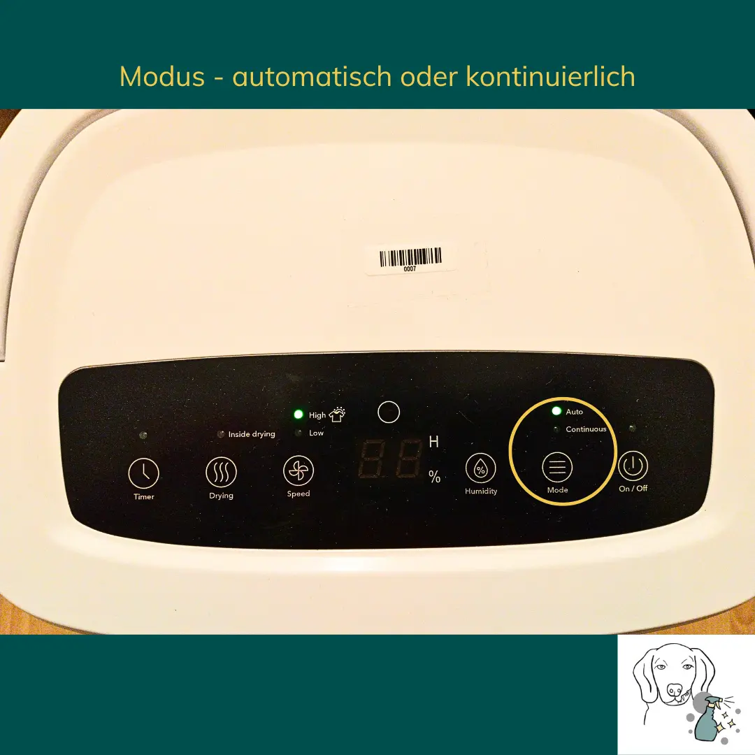 Drücke die Taste Mode und entscheide so, ob du den Entfeuchter im Dauer- oder Automatikmodus betreiben möchtest.