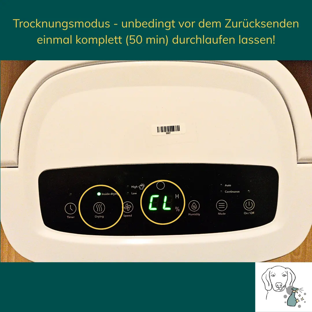 Der Modus dauert ca. 50 Minuten, das Gerät schaltet sich danach automatisch aus. Der Kondensatbehälter muss trotzdem seperat getrocknet werden.