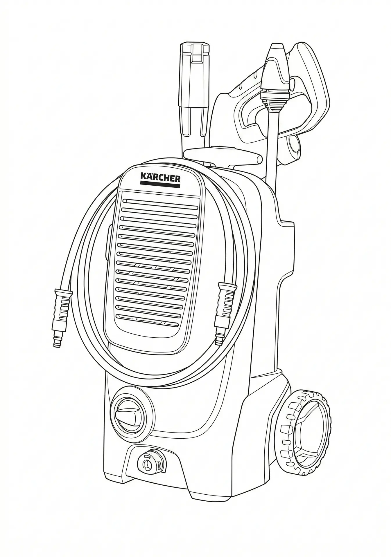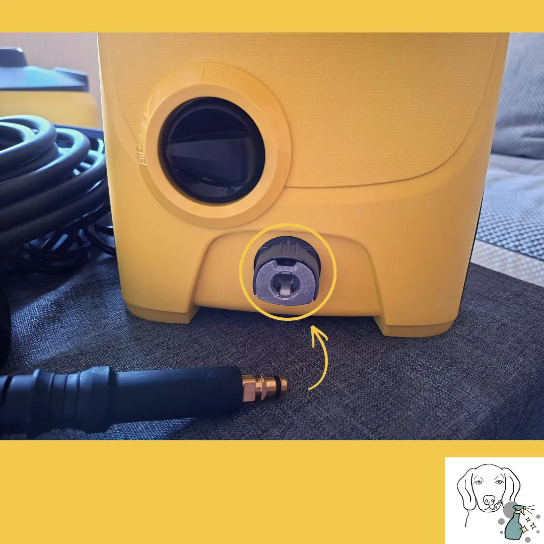 Der Hochdruckschlauch wird im unteren Bereich auf der Vorderseite des Geräts montiert. Die andere Seite des Schlauches muss fest an die Hochdruckpistole angeschlossen werden.