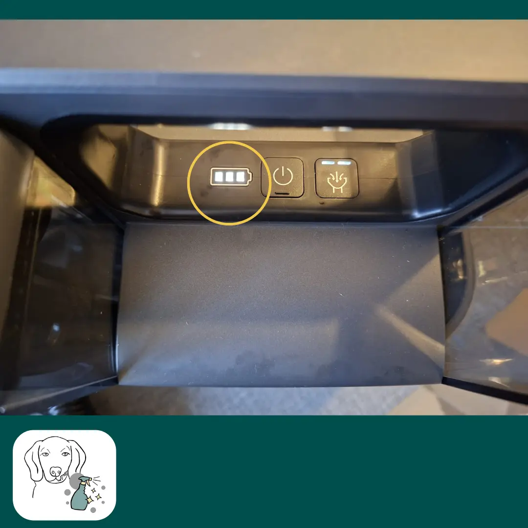 Leuchtet ein Strich ist der normale Modus aktiv (Akku hält ca. 35 Minuten). Leuchten beide Striche saugt der Nasssauger stärker (Akku hält ca. 20 Minuten).